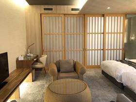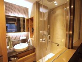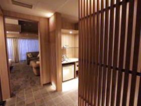 木のぬくもりと落ち着いた間接照明で、和モダンな大人の雰囲気をお楽しみください。内装と、トイレ・洗面台・シャワールームにも高級感のある和テイストを施し、またごゆっくりお休み頂けるようベッドは、シモンズ社製のゆったりサイズ(幅120cm)のセミダブルが2台のツインです。