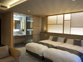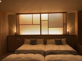 木のぬくもりと落ち着いた間接照明で、和モダンな大人の雰囲気をお楽しみください。内装と、トイレ・洗面台・シャワールームにも高級感のある和テイストを施し、またごゆっくりお休み頂けるようベッドは、シモンズ社製のゆったりサイズ(幅120cm)のセミダブルが2台のツインです。